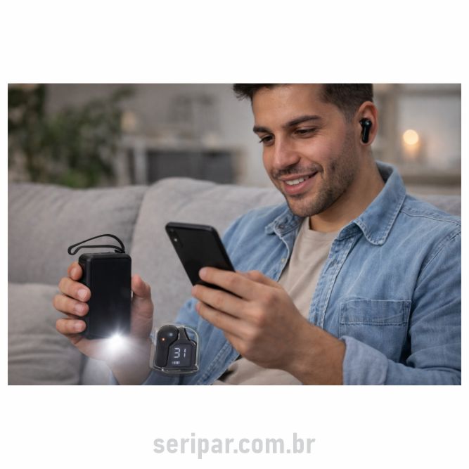 Kit composto: Power Bank 10.000mAh com Lanterna e Multissaídas (10,6×6,7×2,7cm) Fone de ouvido Bluetooth TWS com comando touch e case carregador à prova dágua. Possui display de bateria. Acompanha cabo USB Tipo-C. Tamanho (4,9×4,2×2,8cm) Embalagem para presente em algodão (140 x 200 mm) com tag Personalizável. Personalização dos itens com Logomarca.
