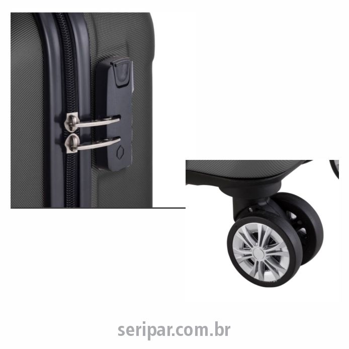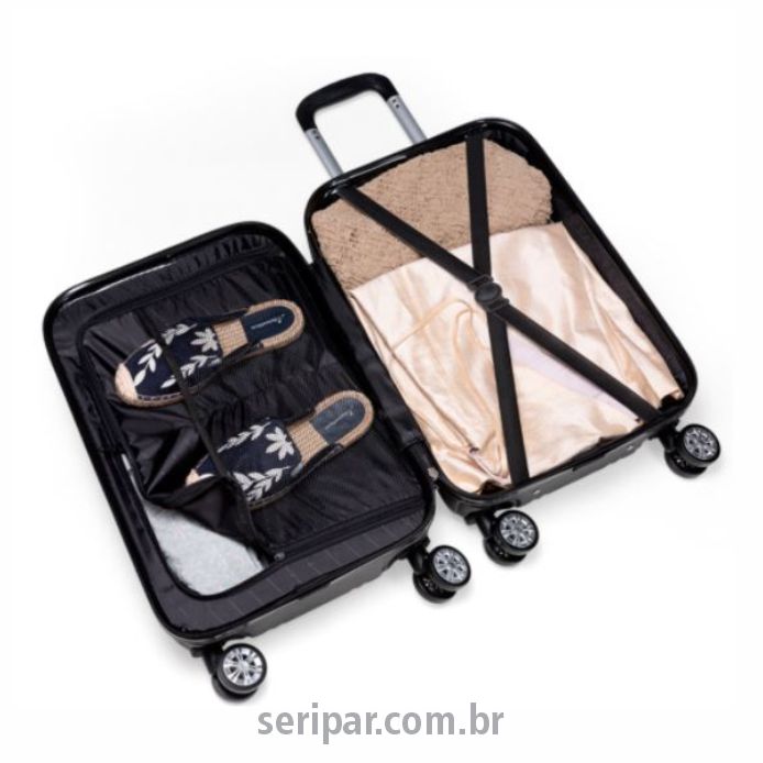 Mala de viagem On Board. Fabricado em ABS Com 4 rodas duplas com giro 360 graus. Sistema de carrinho com ajuste de posições. Alça de mão superior. Trava ziper . Cintas elásticas cruzadas. Painel divisor com bolsos em tela. Chapa metálica para personalização. Tamanho 350 x 550 x 220 mm. Personalizada