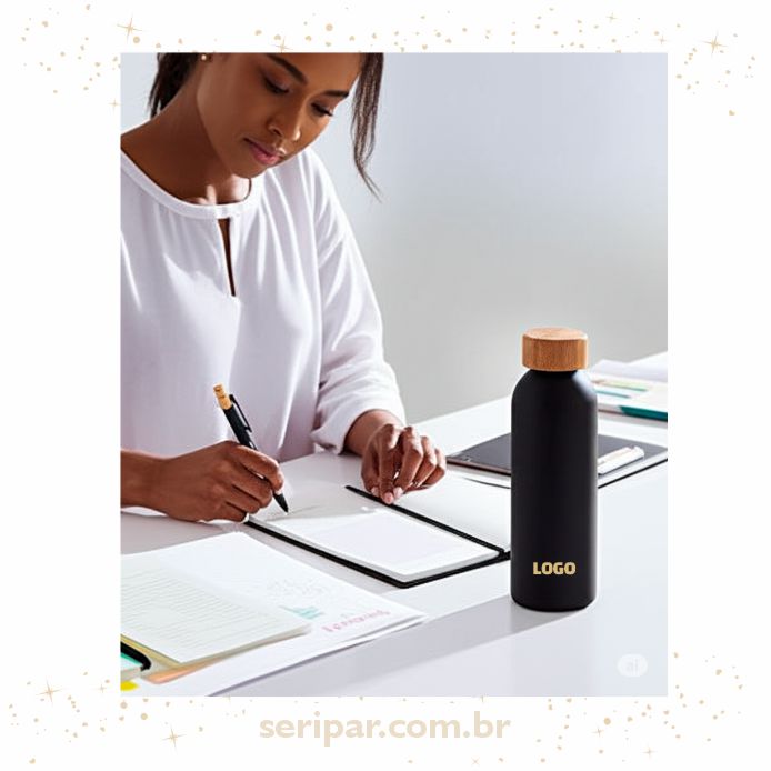 Kit Composto: Caderno A5 de capa dura em tecido poliéster 100% reciclado (100% rPET) e detalhe em bambu. O interior contém 80 folhas pautadas. Garrafa em aluminio com tampa bambu, capacidade 550 ml. Caneta esferográfica em aluminio com detalhe bambu. Fornecida em caixa presente 240x240x70mm. Personalizado com sua logomarca.
